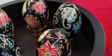 Handmade pysanky eggs from a local Ukrainian artist, supporting those in need in Ukraine.